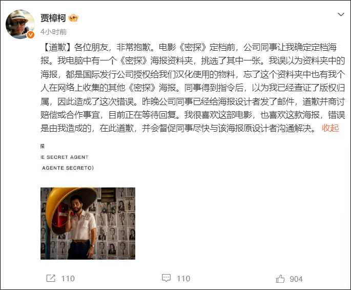 近日,电影《密探》中国官方海报被曝是盗用巴西海报设计师的个人作品,引发争议。3月18日,贾樟柯在社交平台发文道歉: