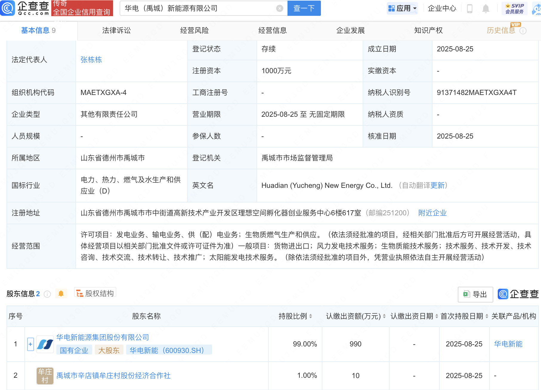 近日,华电(禹城)新能源有限公司成立,注册资本1000万元,经营范围包含:生物质燃气生产和供应;风力发电技术服务;生物质能技术服务等。企查查股权穿透显示,该公司由华电新能(600930)等共同持股。